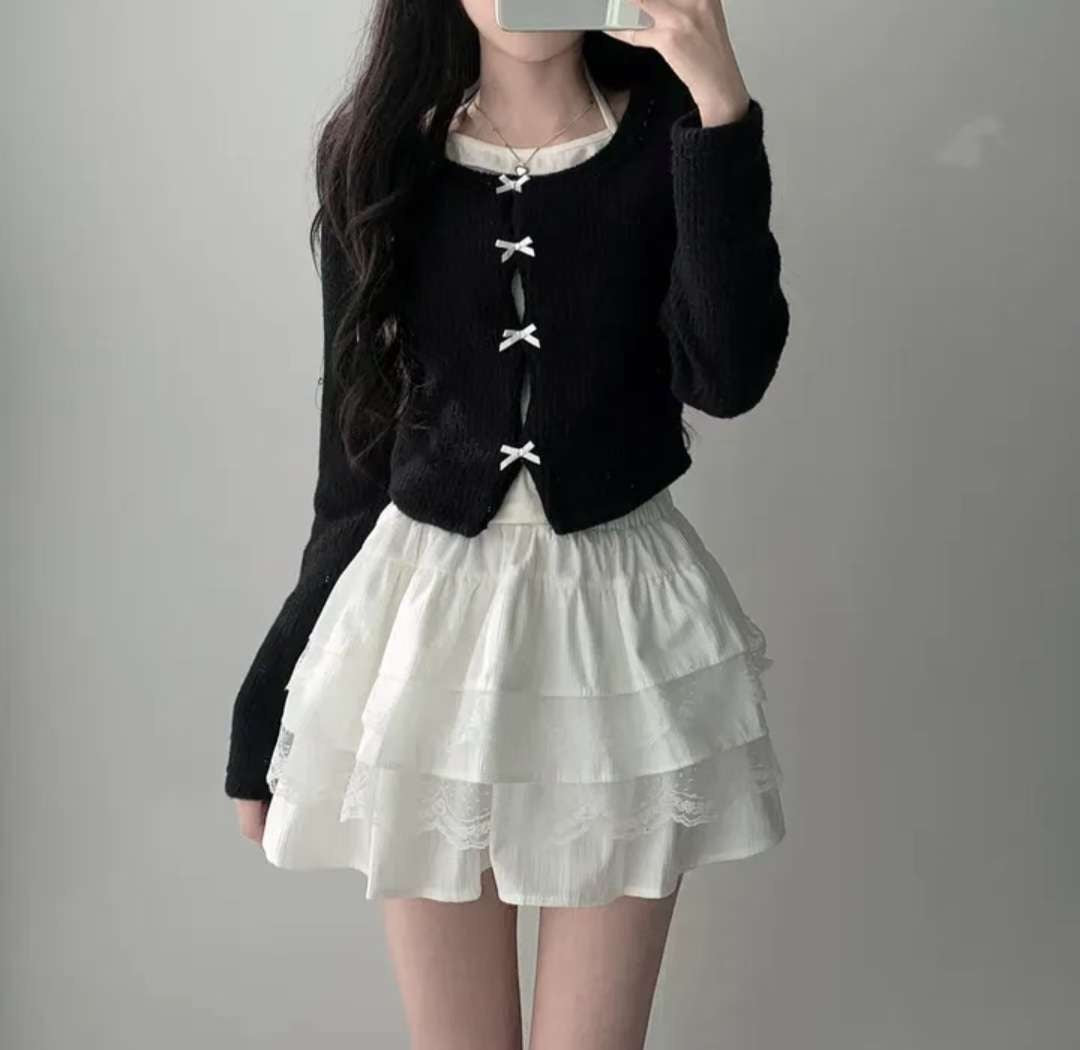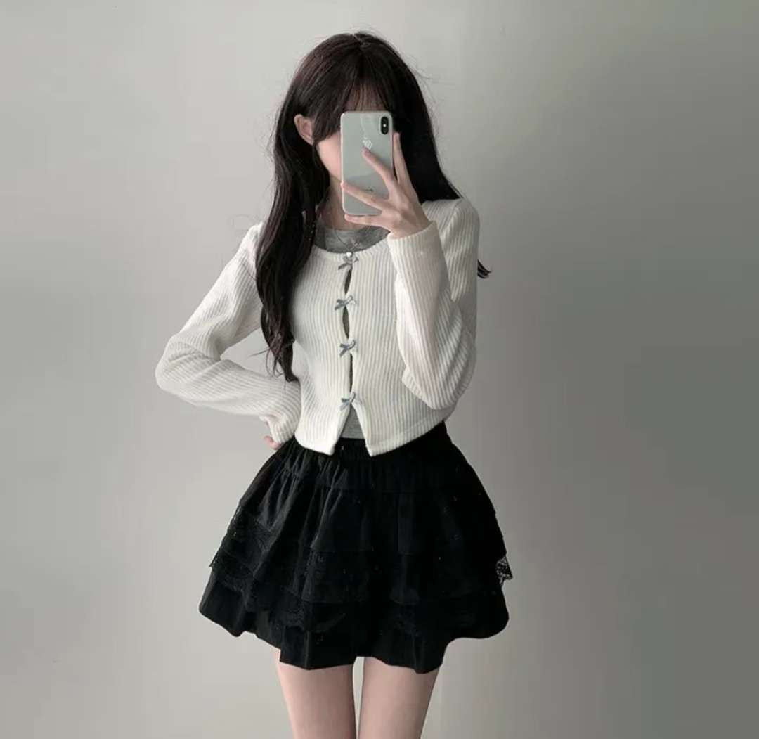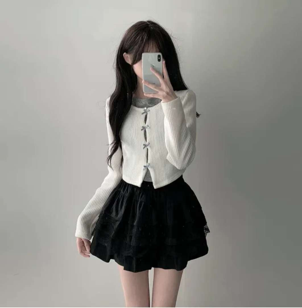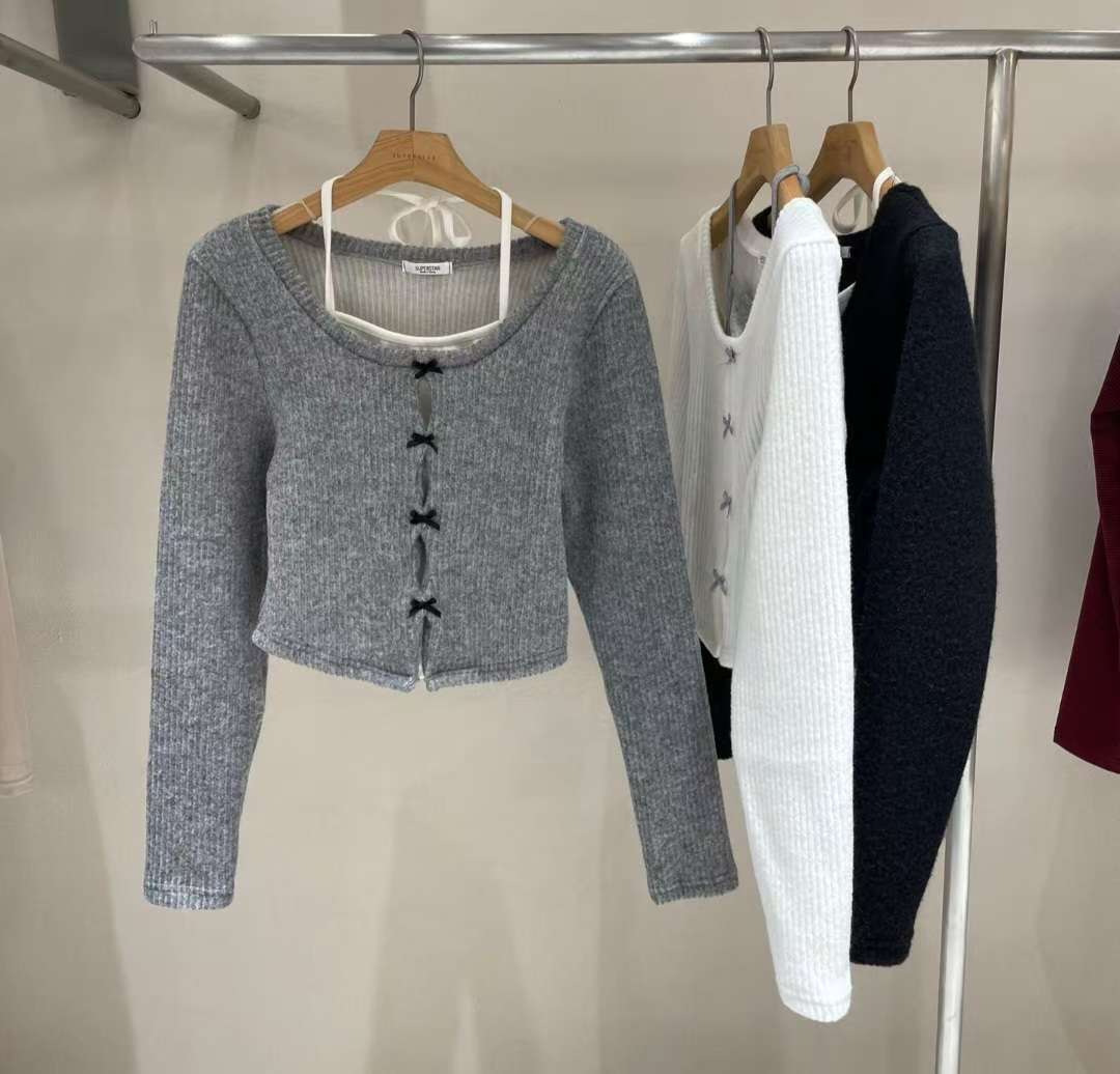 [預訂] \甜美假兩件/ 絲帶蝴蝶結掛頸Top