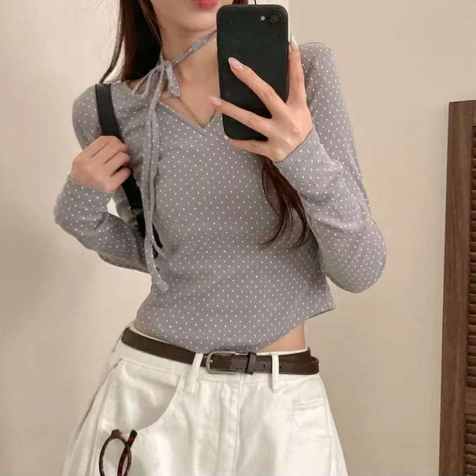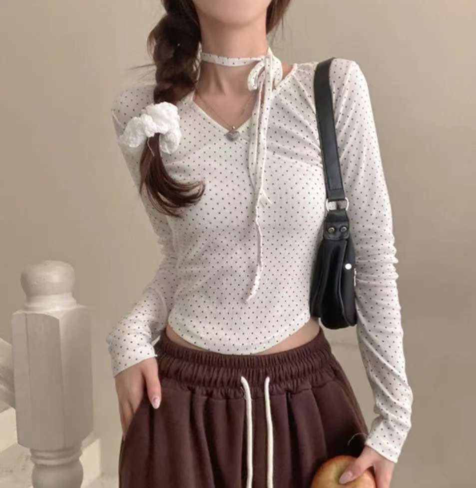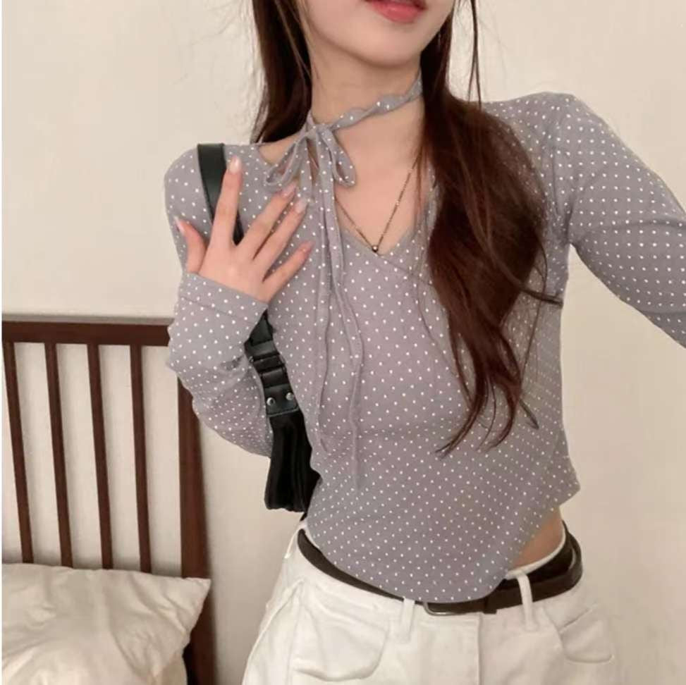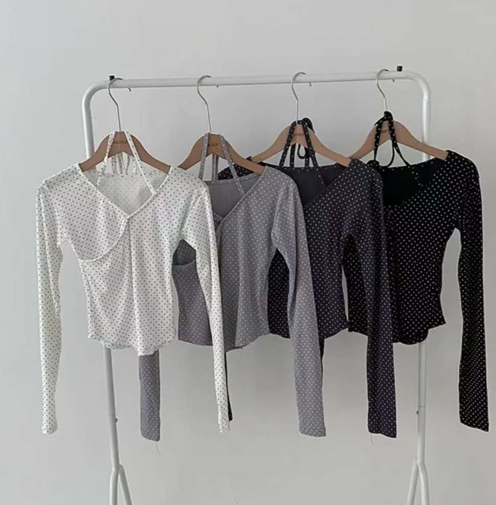 [預訂] \附頸帶/ 波點疊布長袖Top